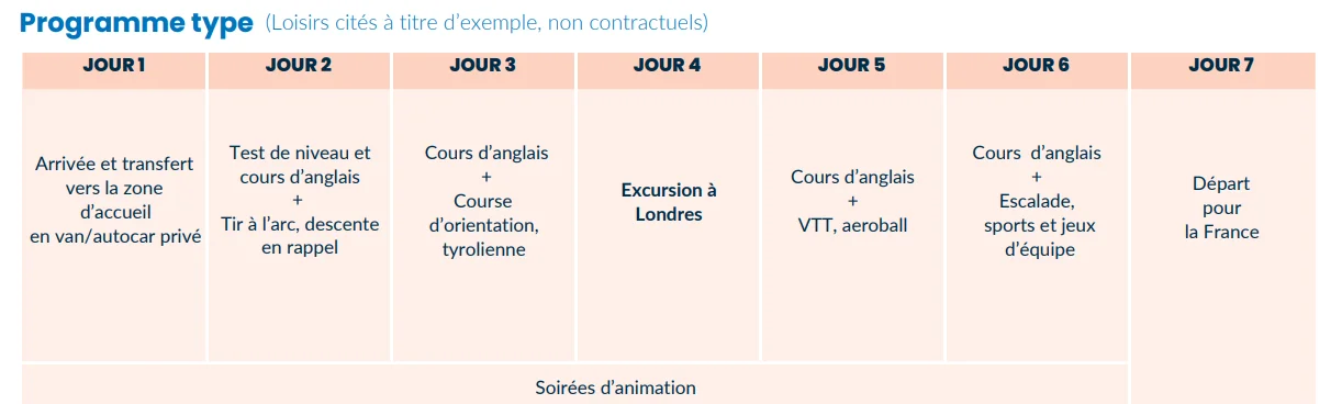 Le séjour propose quatre demi-journées d’activités sportives variées telles que : escalade, tyrolienne, VTT, tir à l’arc, descente en rappel, jeux d’orientation ou encore sports collectifs… Tous les loisirs sont encadrés en anglais, pour prolonger l’apprentissage linguistique en action.
