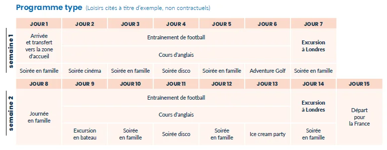 Ce séjour foot en Angleterre est possible entre le 28 juin et le 26 juillet, pour une durée de 1 à 4 semaines.