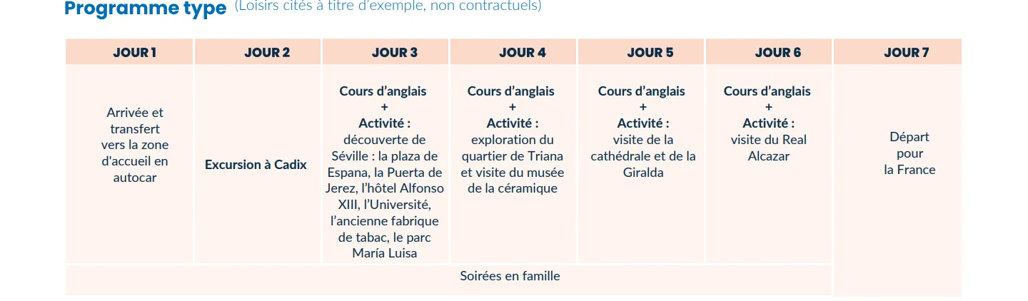 Ce programme s’adresse aux jeunes désireux de vivre une expérience d’immersion à l’étranger dans un cadre sécurisant. À la fois dépaysante, chaleureuse et accessible, Séville constitue une destination idéale pour allier apprentissage linguistique, découverte culturelle et moments conviviaux.