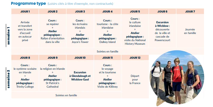 – 2 journées d’excursion pour découvrir les principaux sites de la région d’accueil.