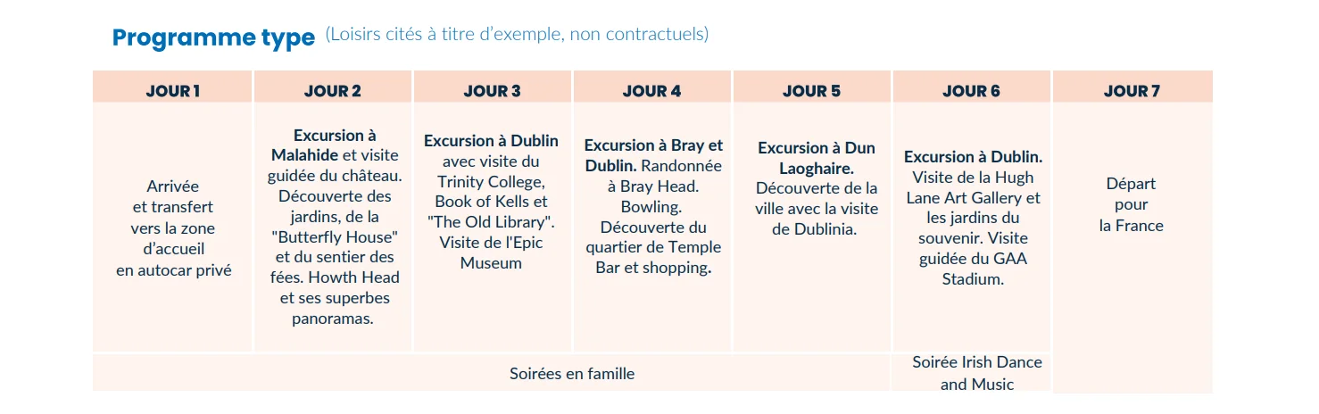 Les loisirs constituent le cœur du programme, avec cinq journées complètes d’excursion autour de Dublin. Les jeunes partent à la découverte de lieux emblématiques tels que le Trinity College et le Book of Kells, le musée EPIC dédié à l’émigration irlandaise, la Hugh Lane Art Gallery ou encore le GAA Stadium, temple du sport national. Ils explorent également les environs : Malahide et son château féerique, Bray et ses paysages côtiers, ou encore Dún Laoghaire et Dublinia, pour une plongée dans l’histoire médiévale.
