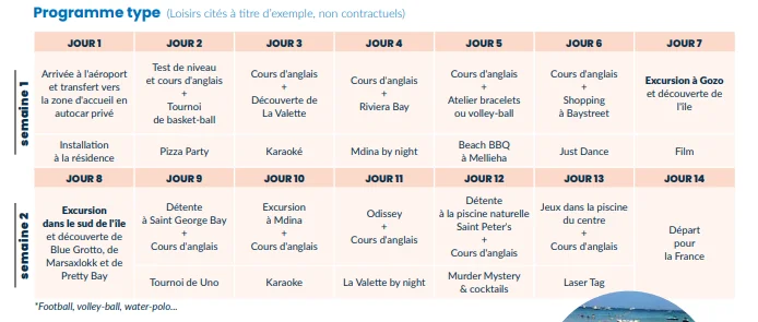 (Loisirs cités à titre d’exemple, non contractuels. Voir le programme type du séjour linguistique à Malte.)